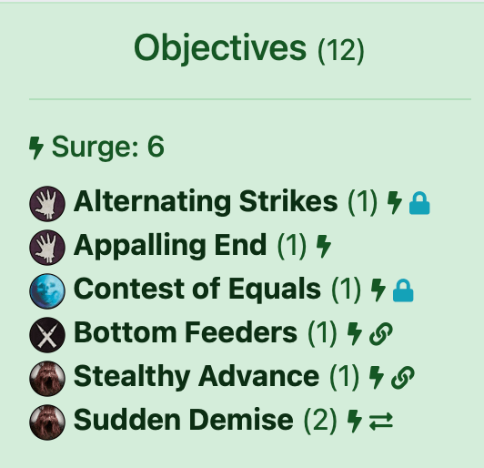 I have 3 kill surges: Suddem Demise, Appaling End, and Bottom Feeders. I recommend prioritizing Sudden Demise over all of them if you have a choice. I score it pretty reliably with 4 pings in my deck and lethals. Appalling End is really easy since most of my kills are minions anyways. Finally, Bottom Feeders is useful since the number of times I killed someone with only 1 fighter adjacent to them can be counted on a hand that had an unfortunate run-in with a shredder. Keep in mind, Bottom Feeders is scored on ANY kill, not just attack actions, so you can use Dynamic Cage in a pinch.