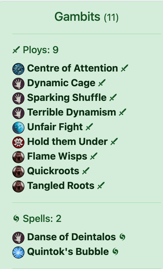 Finally, my gambit spells are Danse of Deintalos and Quintok’s Bubble. Danse is hard to cast but can be nice if it goes off, however, it loses value late game since it only works on Inspired Conductive fighters. Quintok’s Bubble is to provide extra survivability to someone, usually Deintalos.
