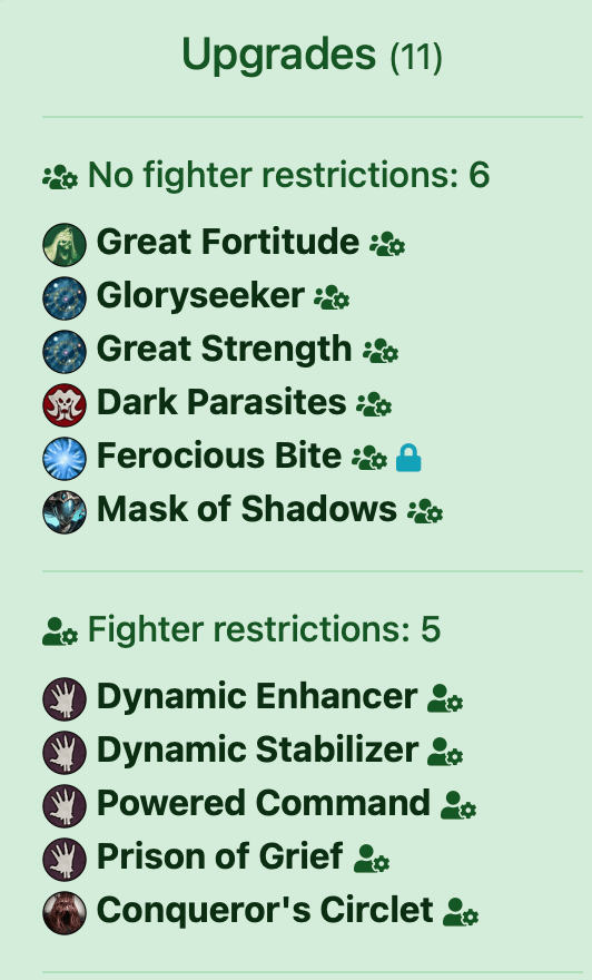 Gloryseeker, Great Strength, and Dark Parasites are my damage upgrades. Dark Parasites is fantastic (give it to Coyl… trust me) since you get one-shotted anyway, even without the +1 Damage thing. Great Strength is general +1 damage, which is always nice. Gloryseeker is to put down bigger fighters and makes Deintalos 2 damage at range 3, since it has no range restriction.