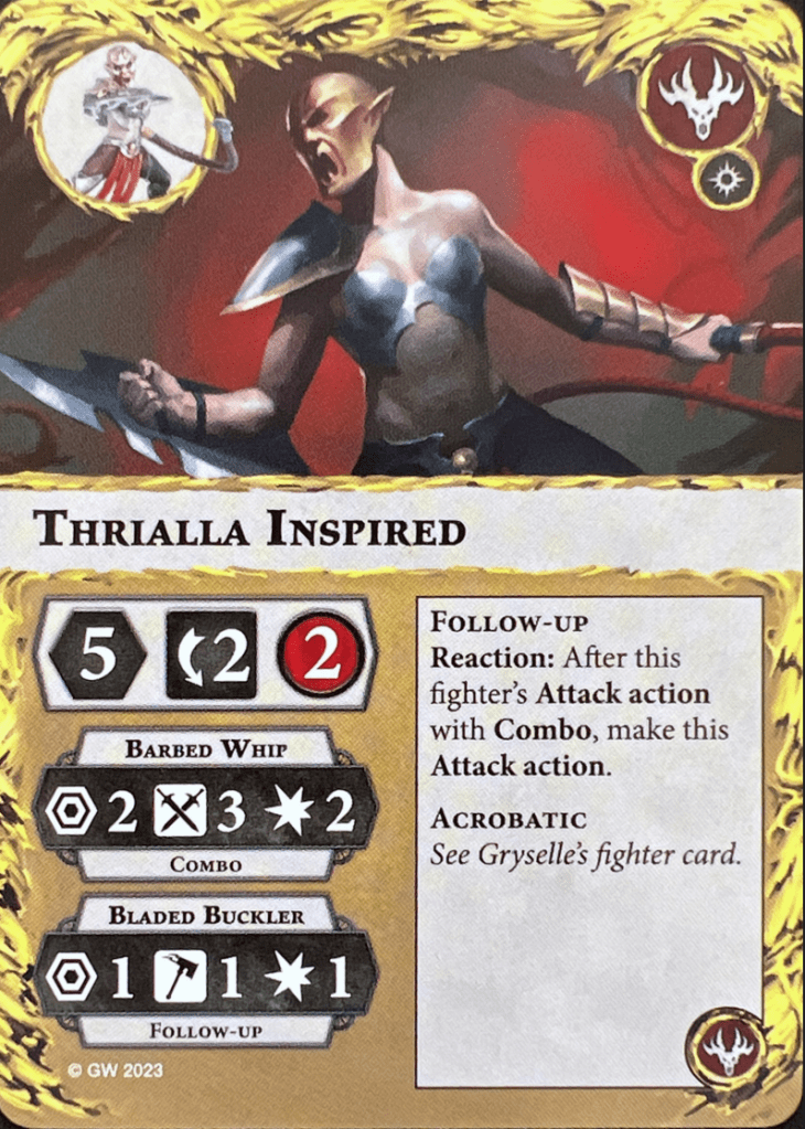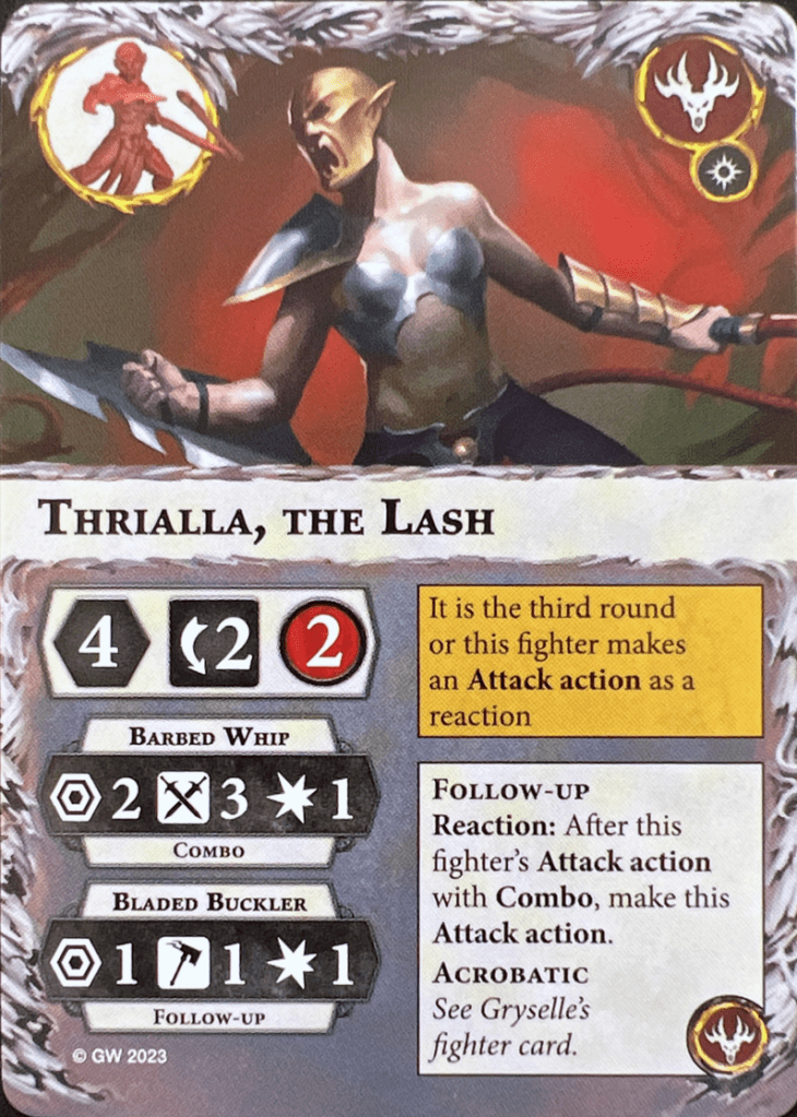 Thrialla is literally Khamyss lite. They even have the same attack names! She is the one fighter in the warband who can immediately use the Combo keyword, and it is also her inspire condition. I like that the Combo attack does not need to be successful to use the Follow-Up. When she is inspired, she gains +1 move and +1 damage on the Whip, which allows her to do 3 damage. She seems to be the least accurate fighter so far, and the Acrobatic ability doesn’t provide much help either. Overall, I would use this fighter as the one who has to get close to the enemy, since she can hit multiple of them at once.