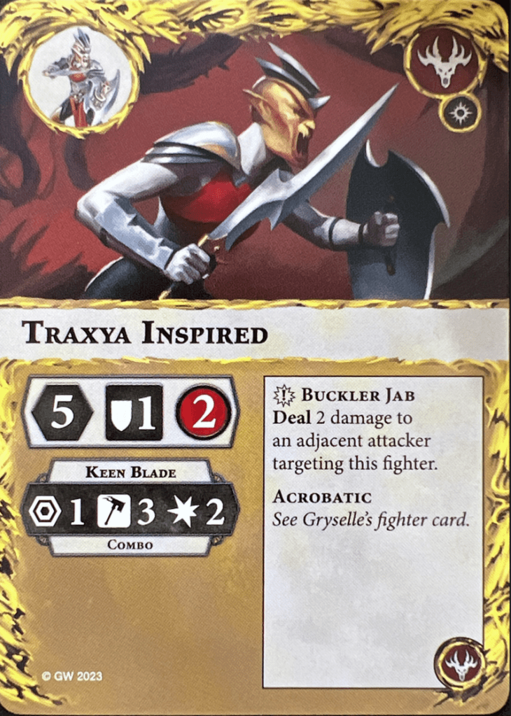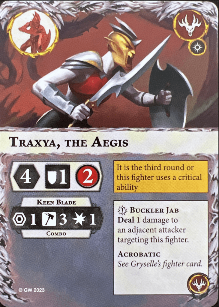 Traxya was probably meant to be the defender of the team, however, she has the least accurate defense and most accurate attack. The attack is very accurate but very weak. She is the only fighter with 1 Shield in the warband, but she still has the Acrobatic ability. She has a cool ability where if she rolls a crit in defense, she gets to deal 1 damage to the attacker if they are adjacent. She inspires by using a critical ability, which seems to be the hardest one so far (since she only has 1 dice and 1 critical ability). When she is inspired, her 1 damage on a crit ability turns to 2 damage, which can be hilarious. She also gains +1 move. Overall, someone who can potentially be very annoying to fight but is very bad without card support.