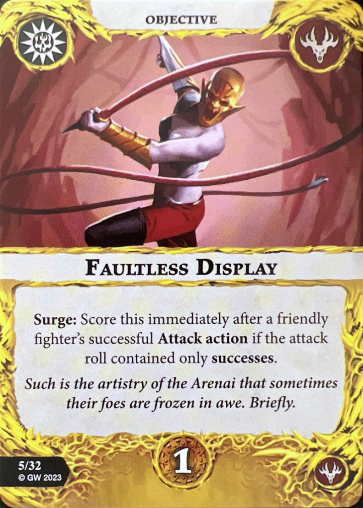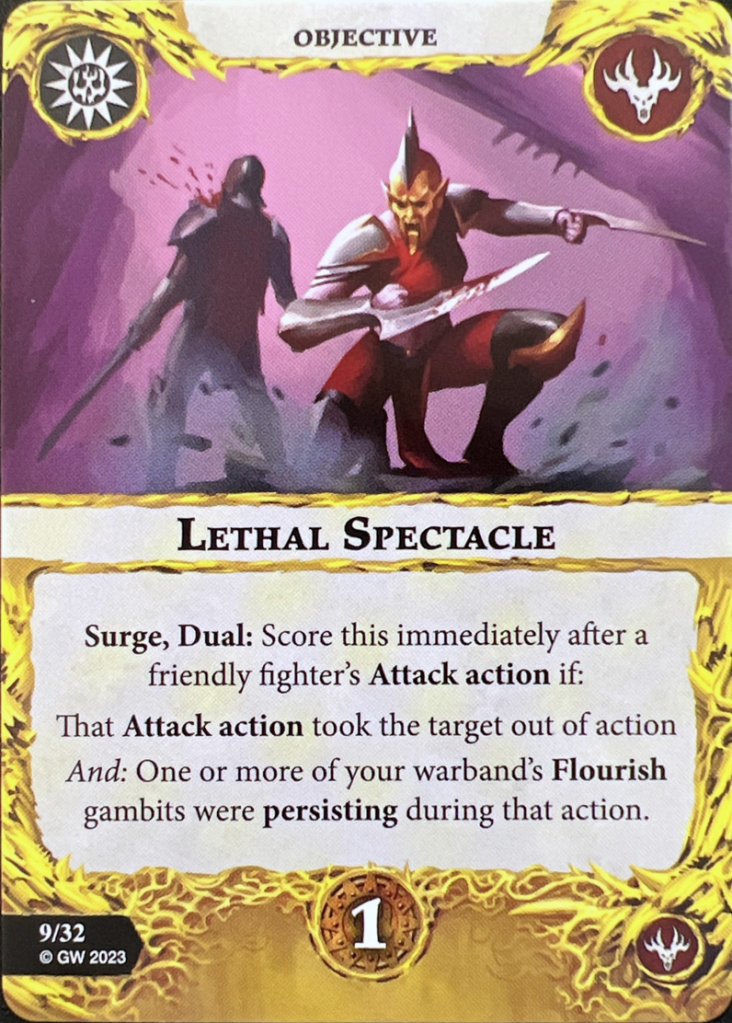 Exult in Violence – While this is a one glory objective, it should be an auto-score in Rounds 2 and 3, assuming your fighters are still alive. This is very similar to cards like Move or Die, where they don’t give a lot of glory but they GIVE it for sure.