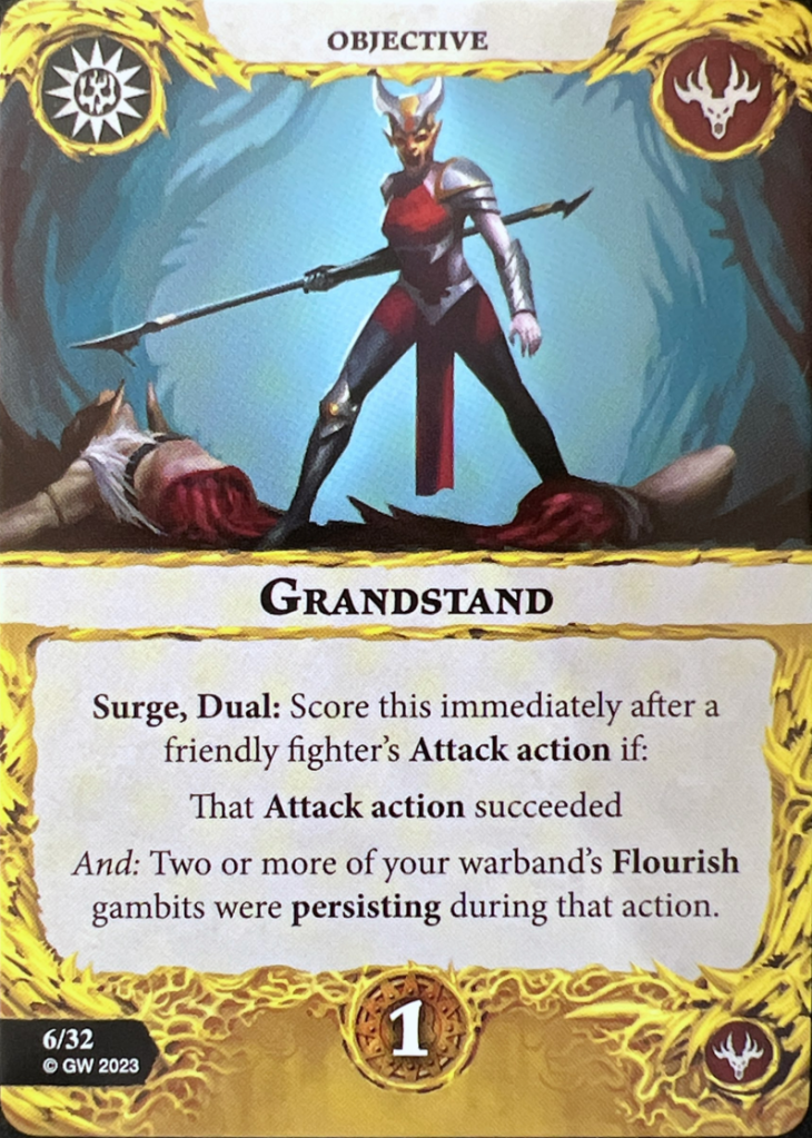 Grandstand – Prepare for some math (I just was preparing for my math test, sorry). Assume you have all 5 Flourish gambits in a power deck of 20 cards. The chance of you drawing one of them in your hand is 25%, and the chance of drawing 2 of them is 10%. Since this objective requires the attack to succeed, those Flourishes must be discarded since that is how they work. This means that you have a 10% chance to even have a shot at this by drawing the Flourishes, but then, you must roll the successful roll, and after that, those 2 Flourishes are discarded. In my opinion, not worth it for 1 glory.