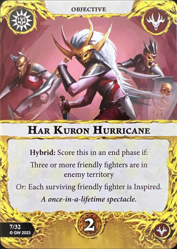 Har Kuron Hurricane – I think you should get the 2 glory for saying the name 10 times fast with no errors. It’s easier than the condition it has. First, you need 3 fighters in enemy territory. in case you couldn’t tell already, I believe these guys are pretty fragile. Or, they need to be inspired. At this point it should be a third end-phase objective, since it’s really hard to stay alive in enemy territory but all your fighters inspire in the last round.