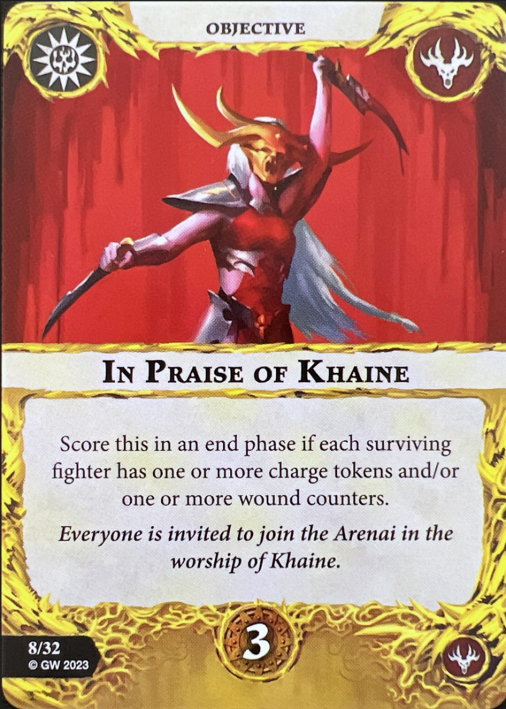 In Praise of Khaine: The 3 glory objective of this warband. It’s really hard to score early game, since you have 5 fighters and cannot charge them all at the beginning. Second, you need your opponent to cooperate and charge their own fighters around since it might be hard to wound them all. It does get easier to score later in game, though.