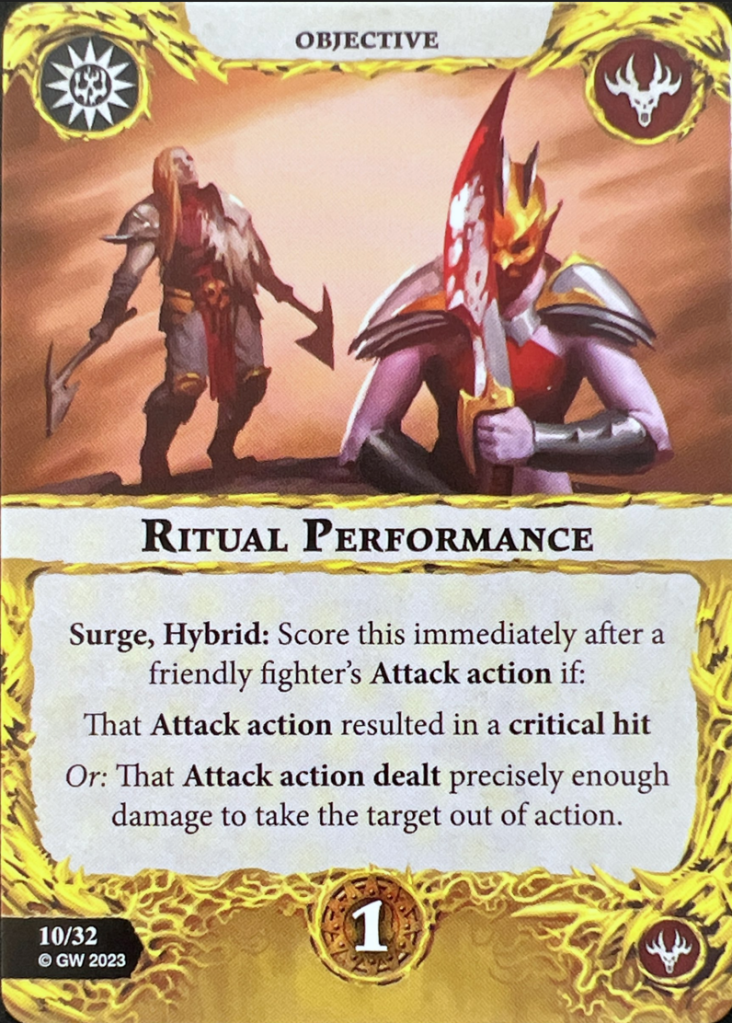 Ritual Performance – This is a really good objective. First of all, its first condition is relatively easy – Roll a crit (and hope your opponent doesn’t). The second condition is harder, but the first condition is easy enough to seriously consider running this card.