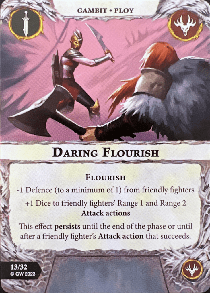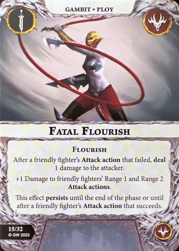 Fatal Flourish – Flourish 3. This one has a MAJOR downside if you mess it up since you only have 2 wounds each (except your leader). If you mess up, you will be left on one wound and susceptible to pings. However, it does give a pretty big bonus. Combo these Flourishes together to create a big explosion of damage (it’s guaranteed, whether or not you hit).