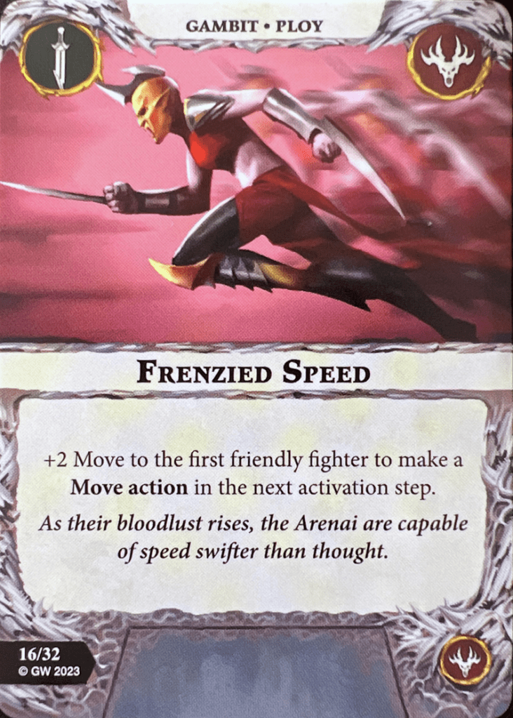 Frenzied Speed – You get +2 move in the next activation. It’s pretty straightforward. What might lead some people not to take this card is your already-pretty-high move of 4-5. It’s a good card, just not for this warband.