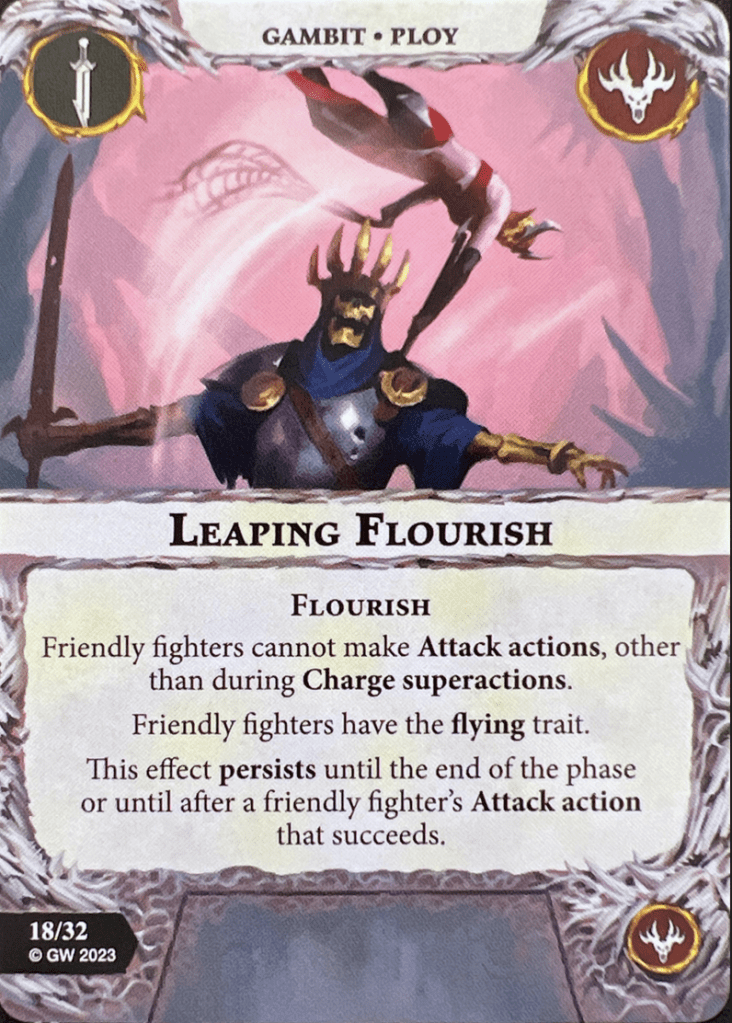 Leaping Flourish – Have you ever thought that Retaria brags too much about being a flying fighter? Not anymore! This card is good against blocked hex enjoyers and people who like to build living walls of fighters (ahem, Deintalos). Other than that, it’s kind of useless. The one redeeming quality I can think of is that you sometimes have a fighter blocking a way to your target; now you can just go through them. Another one is that the downside is easy to avoid, so you can use this to score those Flourish objectives ‘risk-free’.