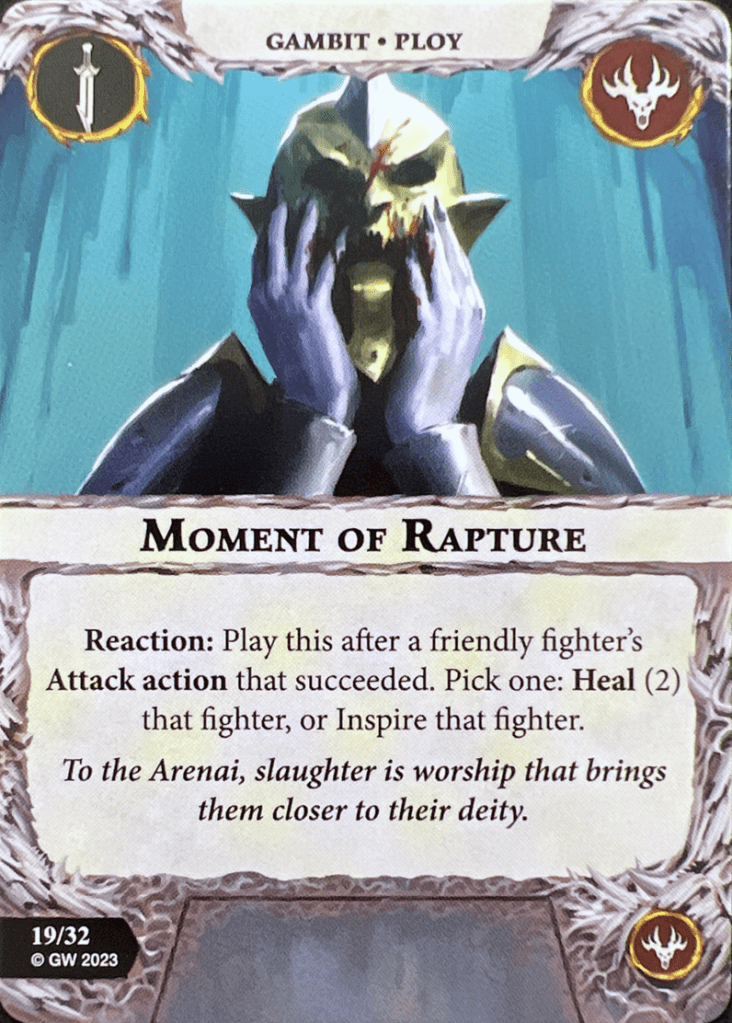 Moment of Rapture – While you can rarely use the heal part due to all your fighters other than your leader having 2 wounds, you can benefit from the inspire part. While 2/5 fighters inspire through making a successful attack, one who doesn’t is Traxya. And she gets that cool ability where she can do 2 damage if you crit defend! Another major use is that you can make your already-hard-to-kill leader even harder to kill. There are lots of uses, but only some are beneficial, and most of them are just for fun.