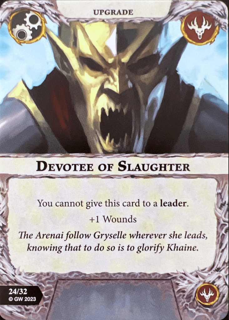 Devotee of Slaughter – This is a good card to give your little Arenai some buffs. I would personally just take Great Fortitude in case I would need my leader to stay alive (which I do). However, if you want more wounds, you can take both cards!