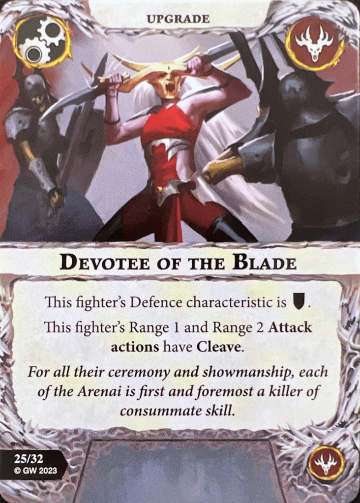 Devotee of the Blade – Imagine you are attacking someone with this upgrade. If they roll a Shield, that’s a success. If they roll a Dodge, that’s a ‘success’ since you take less damage. You also get cleave which is going to be a great bonus against certain warbands.