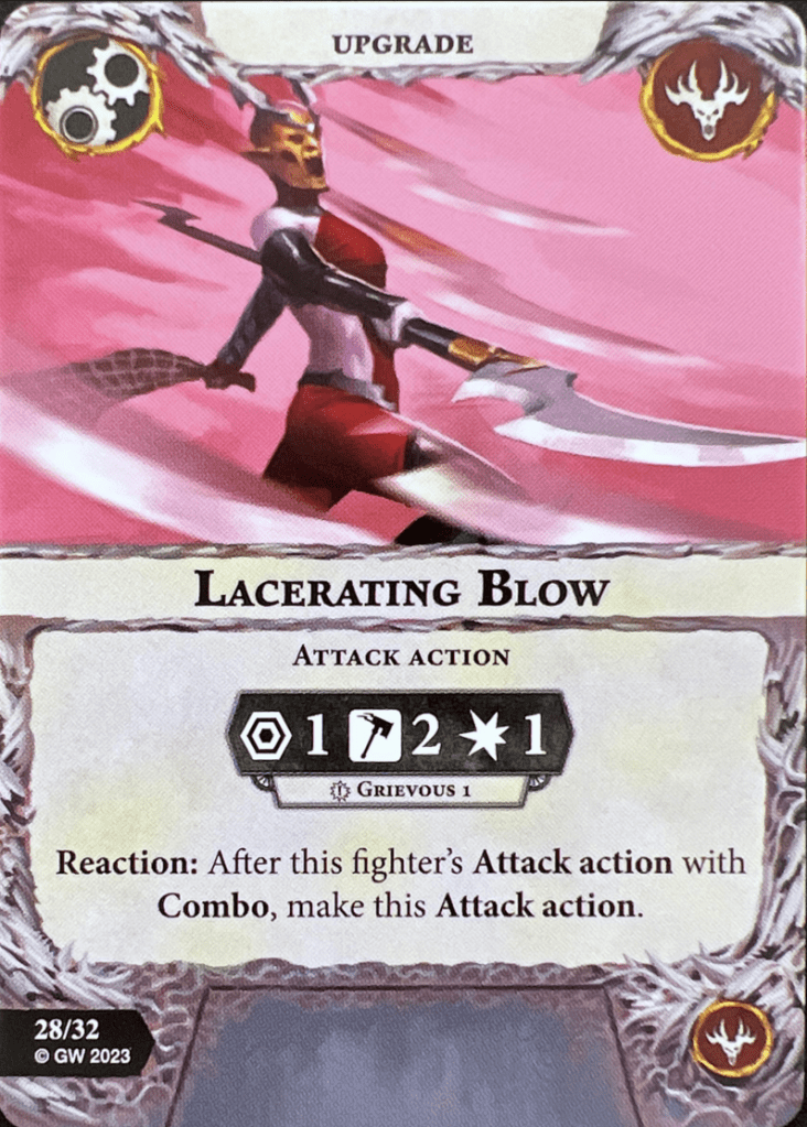 Lacerating Blow – The second combo upgrade and the only one with an immediate chance at having 2 damage. It is also the only Range 1 one, but it is pretty accurate at hitting on hammers. Lacerating Blow is a high risk (since it’s Range 1), high reward (since it’s Grievous 1).