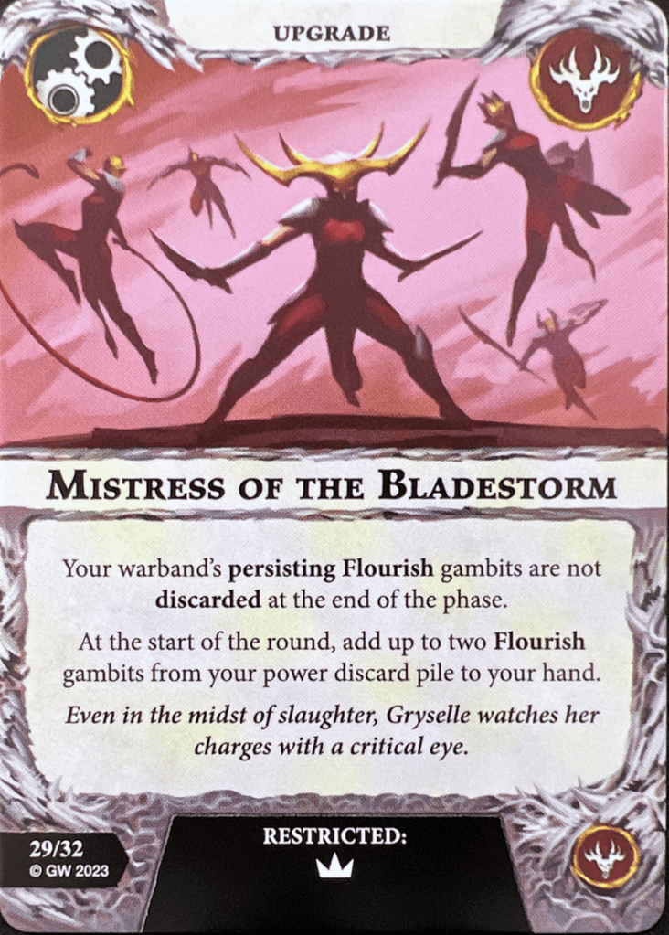 Mistress of the Bladestorm – This is arguably the second-best upgrade in the deck. Since most of your Flourishes are REALLY GOOD, you will need them back in your hand! If you have a Flourish in your hand at the end phase, you can just discard it, draw up one extra card, and then draw it back again at the start of the round. The one downside I can think of is if you have Executioner’s Flourish (Grievious 1, but all attacks only hit on Crits) and can’t roll a single crit, you won’t be able to discard it.