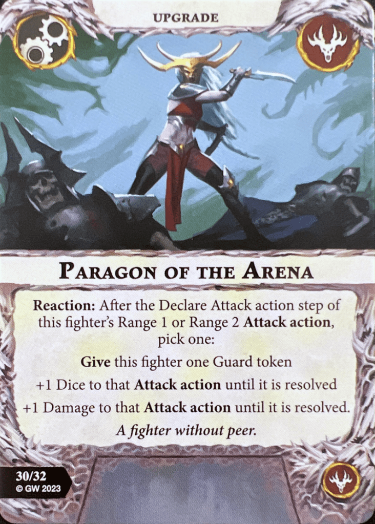 Paragon of the Arena – The best upgrade in the deck! It is Great Strength, Gifted Ferocity, and Illusory Form all rolled into one! It also works multiple times in one activation due to Combo. You can make a first attack with the Guard token choice and then use the combo attack with extra accuracy with the dice choice!