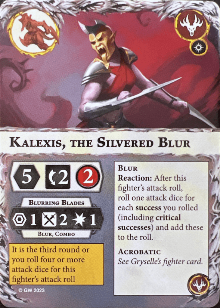 Gryselle is the leader. She inspires either in the third round or when she rolls a crit in attacking (and hits), and when inspired, she becomes faster and more accurate. I really like the Acrobatic ability she has, it’s like the Wurmspat’s, however slightly better/worse since they use dodges, but these have 2 dice. The attack action is decent but gets pretty good when inspired. Overall, a pretty balanced, slightly overpowered fighter, especially when you consider the upgrades they have.