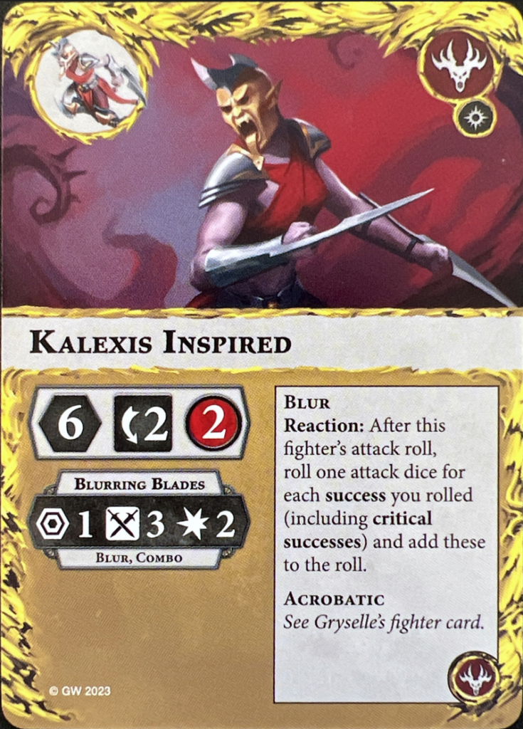 Kalexis is very fast. She has 5 move when uninspired but goes to 6 when inspired, tying with the Duke’s Harriers for the fastest fighter. She inspires by rolling four or more dice in an attack, but to help with that, she has her Blur ability. If you include every +1 dice card available to them and roll only successes, you can roll a staggering 40 dice (but that is every, every, every single card, and I didn’t bother checking if they work with each other). She is pretty difficult to inspire as she needs to roll 2 hits while having the Fury symbol, but she gains a lot when she does. A downside is her fragility; 3 wounds would have made her a lot better. Even though she does have the Acrobatic ability, it’s going to be hard to consistently negate a lot of damage. Overall, the pretty weak when uninspired but a real threat when inspired and upgraded.