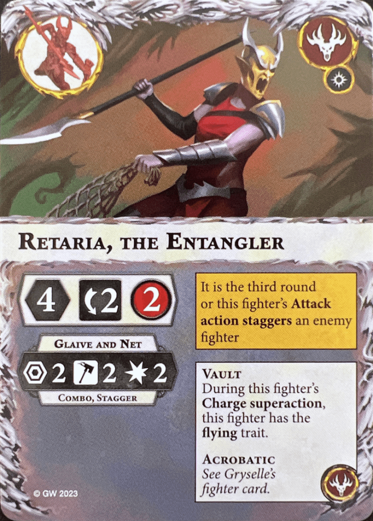 Retaria, a.k.a Drusylla with 2 wounds, inspires via staggering (which I like). She has a built-in Stagger attack which is pretty accurate and she gains a lot when inspired, such as an extra dice, move, and permanent flying. Arguably faster than ‘The Silver Blur’, since she can move through blocked hexes and other fighters. She is pretty accurate and can reach almost any fighter. However, she is also really fragile, and the Acrobatic ability doesn’t really help with 2 wounds. Overall, kind of like an assassin, as she can reach almost anywhere on the board with her flying.