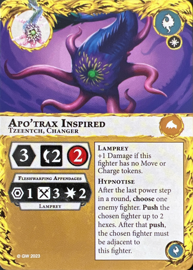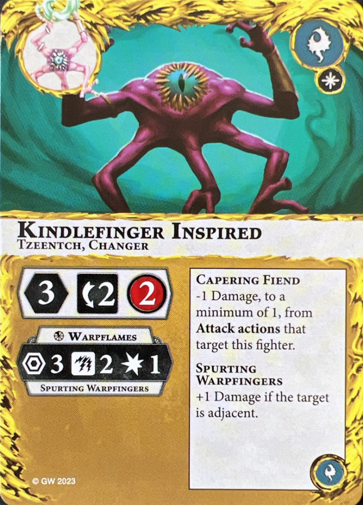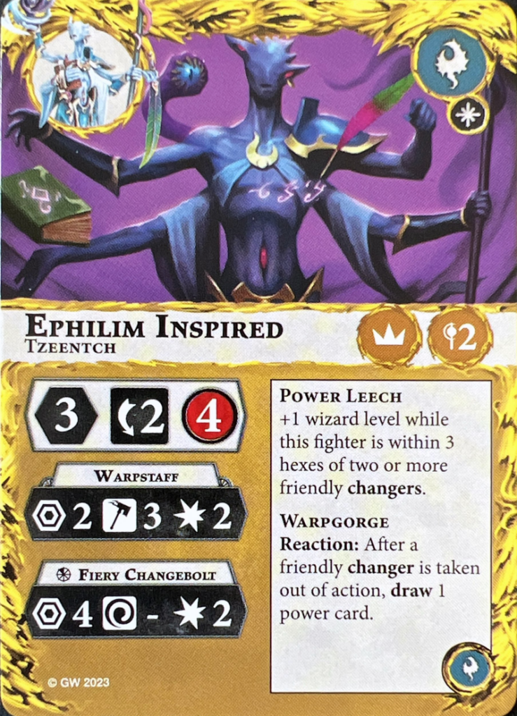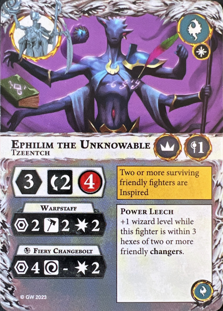 Ephilim the Unknowable is a weird alien-like follower of Tzeentch and the warband’s leader. He has a decent profile, with 3 Move, 2 Dodge, and 4 Move while uninspired. He also has 2 attacks, one of which is a Range 2, 2 Smash, and 2 Damage attack, which is the average attack an uninspired leader has. However, he also has a Range 4, 2 Damage attack, which hits on swirly-wirlies (Focus)! This is the first non-upgrade, 2 Damage, Range 4 attack I can remember! Ephilim is a level 1 wizard, which might make the attack seem not excellent. However, with his Power Leech ability, he gains +1 wizard level for being within 3 hexes of 2 or more friendly changers (who are literally everyone other than him). This makes the attack equivalent to 2 hammers! His inspire condition is pretty difficult, forcing him to hide his inspired changer at the back and try to keep another one alive to inspire in Round 2. When he does inspire, he gains +1 dice on his Warpstaff (Range 2 attack) and +1 Wizard level, allowing him to be the only level 3 wizard in the game without upgrades (if you use his Power Leech ability)! He also gains an ability, Warpgorge, allowing you to draw a power card whenever someone dies. This is a pretty nice ability, allowing you to draw at most 5 cards per game (assuming you revive one fighter and all of them die). Overall, Ephilim seems pretty powerful but reliant on his warband to get him to his full potential.