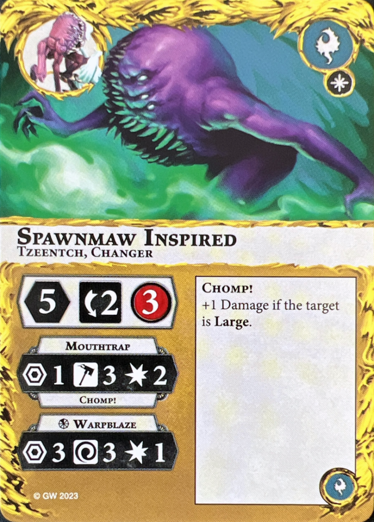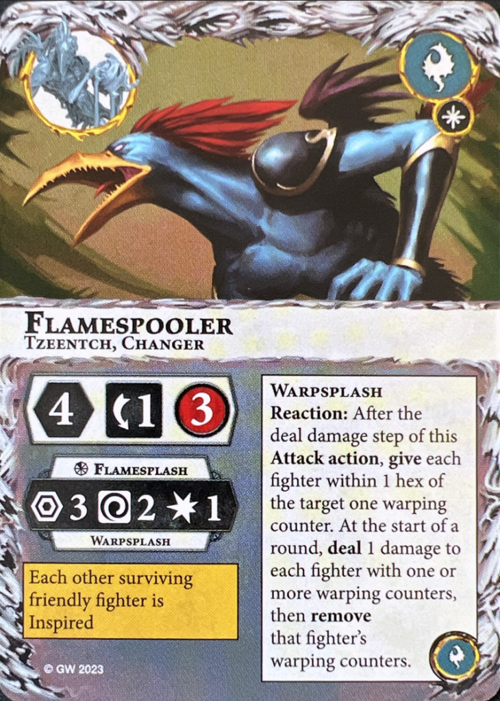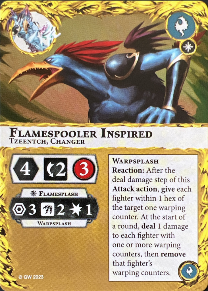 Flamespooler is a bird-like thing. He has a ok profile, with 4 Move, 1 Dodge, and 3 Wounds. Not very tanky, but he can take 1 hit. His attack is a Range 3, 2 Focus, 1 Damage attack with an ability Warpslash. While the attack itself isn’t eye-opening, the Warpslash ability makes it very good. Very basically, it is a ranged Scything. Once you hit someone with the attack, you give everyone within one hex of your target (including the target) a warping counter. At the start of the round you deal 1 damage to everyone with one of those, and then remove them. This makes this ability a literal bomb and can prove fatal when combined with a couple of pings against swarm warbands, I can bet watching your opponent frantically draw cards looking for Great Fortitude to save their upgraded fighter from being blown up by this counter will look hilarious. While this ability is pretty ‘tame’ when used on one fighter, when playing against someone who needs to stick together like aggro Exiled Dead, that extra one damage on everyone will be really annoying for your opponent. When inspired, Flamespooler gets +1 Dodge, and his attack changes to lightning. This is why I would recommend inspiring him second, as he is the only other 3 wound fighter in the warband, not counting Spawnmaw, so the extra defense would be excellent. It also makes him more accurate. Overall, Flamespooler might not last long but will probably be some of your opponent’s biggest fear, especially against swarm warbands! He has the potential to cause a lot of disruption.