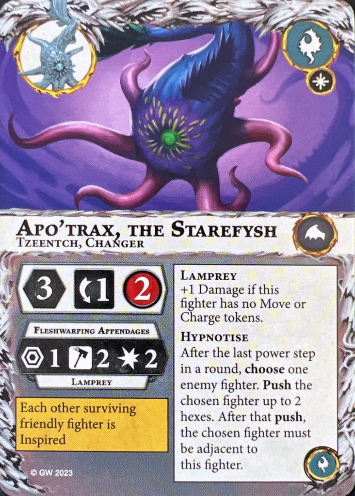 Apo’trax is a Starefysh. He has one of the most underwhelming profiles of the warband, with 3 Move, 1 Dodge, and 2 Wounds. He only has a Range 1 attack, making him have the least threat range. The attack is 2 Smash and 2 Damage with an ability Lamprey, which allows him to do +1 damage if he does not have any move or charge tokens. This might seem bad, since it will be very rare to end up adjacent to an enemy with no move or charge tokens, but he has a second ability to help with that called Hypnotise. After the last power step in a round, he can push an enemy fighter up to 2 hexes, as long as that fighter ends adjacent to Starefysh. That’s a pretty good ability! It can be used to yoink some people off objectives, or just get them closer for Lamprey, or even to potentially deny something like Conquest or Hurricane Force! When inspired, he gains +1 Defense, +1 Dice, and his attack turns to Swords. Plot card wise, I would say he would be the candidate for the push, to get himself into position to maybe hit someone with a Lamprey attack in Round 1. Overall, Apo’trax is a medium attacker who is very frail, but can disrupt the enemies positioning!