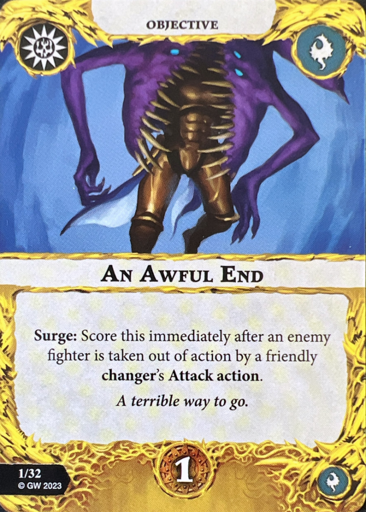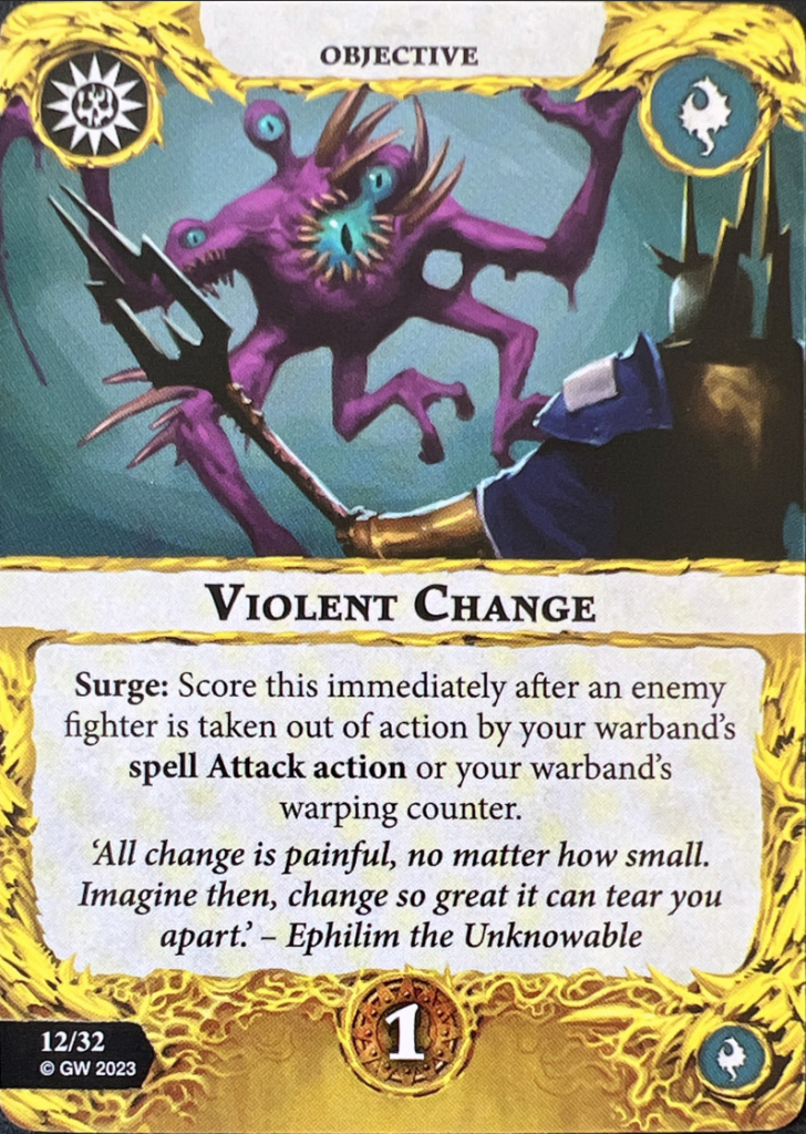 Violent Change – Remember at the VERY start, that card called An Awful End? This is the better alternative I talked about. First of all, your leader can score it, and he has arguably the most accurate attack of the warband at his full potential (tied with both of Spawnmaw’s attacks). Second, you can score this without having to get close like you must with Violent Change since most changer’s attacks that do decent damage are Range 1. Finally, warping counters can score this as well. Overall, if you are leaning into a changer-based build, for example glass-cannon aggro, run An Awful End. Otherwise I would stick with this (or run both and get 3 glory from a single kill?).