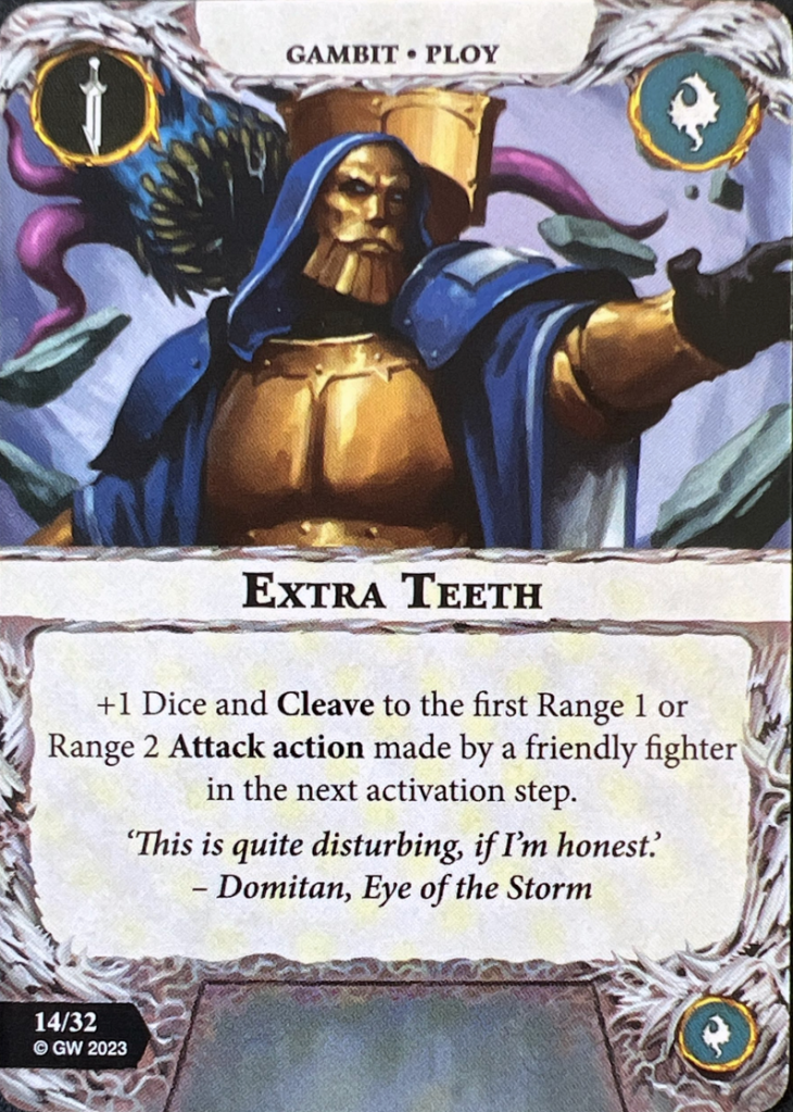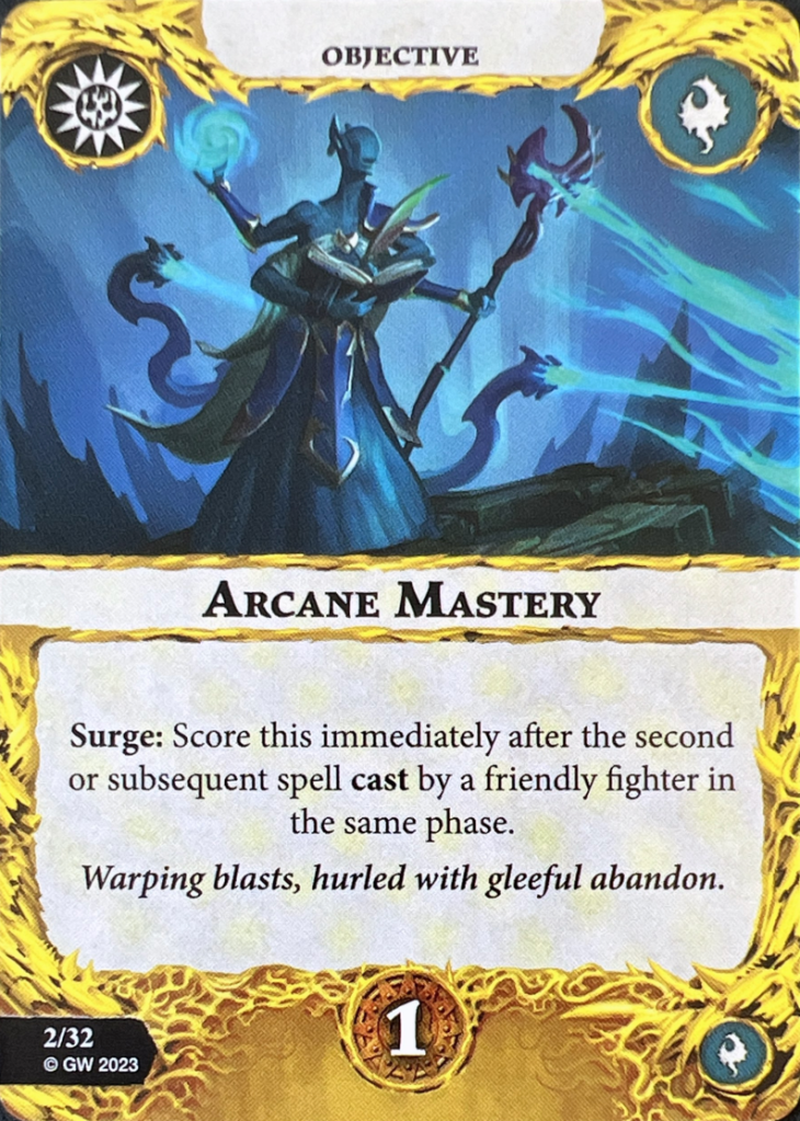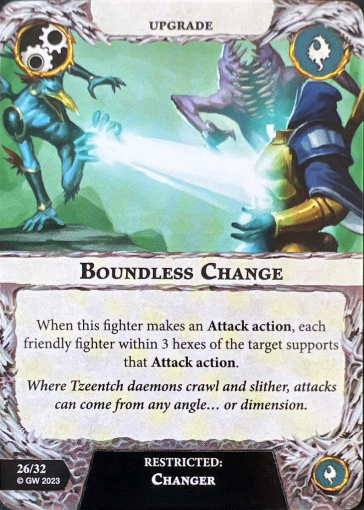 Might of the Great Changer – Deal damage to a second or subsequent enemy in the same phase. No, this isn’t the same as Ineffable Capering. First, it’s a surge, and second, it does not specify with what you have to deal the damage. Ploys, gambit spells, attacks, Reflecting Mask… the list goes on. Keep in mind, it has to be 2 different fighters!