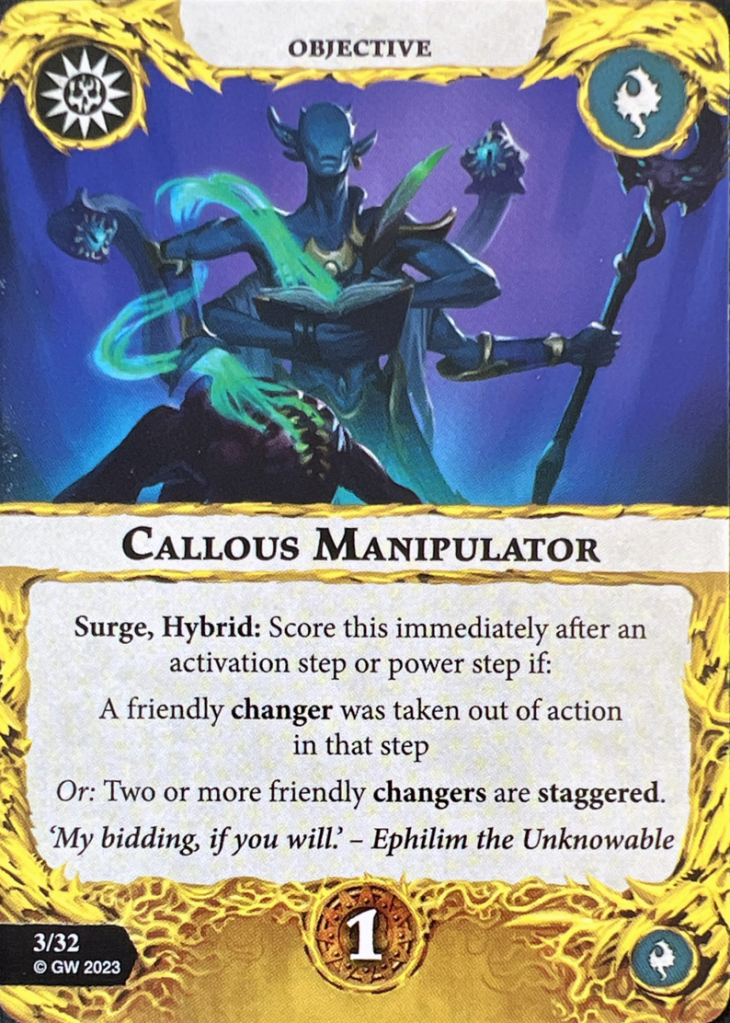 Callous Manipulator – A GREAT card. Score this after an activation or power step when if a changer died, or if 2 or more changers are staggered. First of all, your changers are tempting targets since they aren’t that bulky, meaning you get rewarded for them dying (if your leader is inspired you also get to draw a power card). The second condition is also easy and doesn’t yield glory to your opponent since one of your changers can get staggered through your plot card, and the other one can just delve since that staggers you (or Barge, with the new rules).