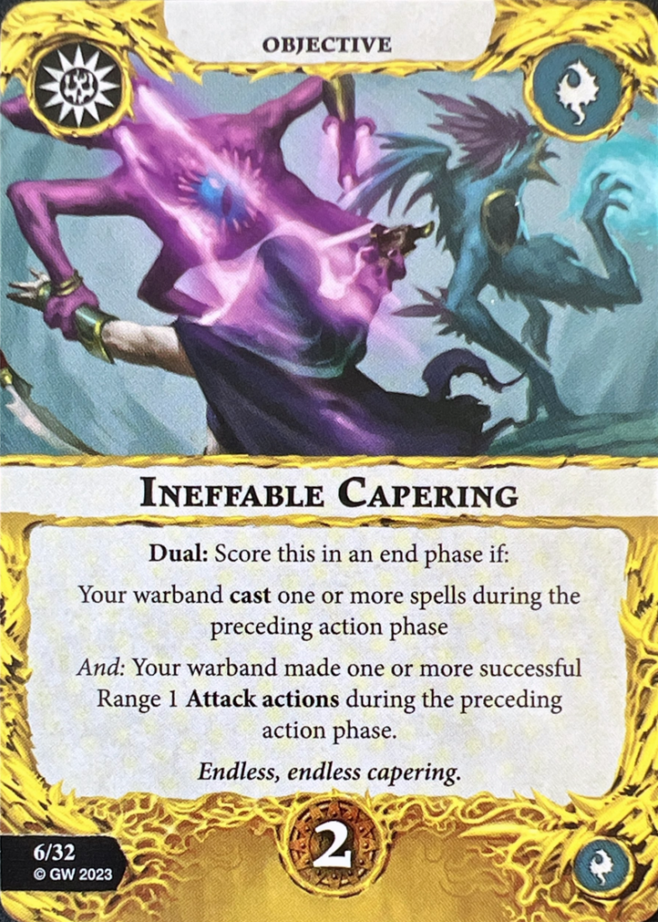 Ineffable Capering – Another 2 glory objective, this time a Dual. You must have made a successful spell cast and a successful Range 1 attack to score this. I think it is challenging, especially since only 2 of your fighters have a Range 1 attack, one of which is pretty inaccurate. The issue with Range 1 attacks is you have to get close to do them, putting your fragile fighters in a tough spot. The spell part is OK, in Round 2 especially, once you have a lot of inspired fighters with accurate spell attacks and Ephilim with his wizard level 3. I just find it hard to make both in one round successfully is pretty tricky.