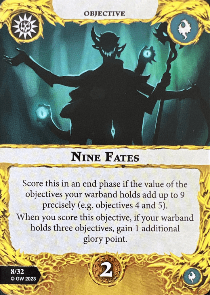 Closing the Circle – Faction Temporary Victory, 2 glory for holding 3 objectives after an opponent’s power step. In Round 1 this is really easy as your plot card lets you push yourself around to get onto objectives faster. An issue I see with this is your changers dying later into the game, making it hard to have 3 fighters on an objective at once. This is also another way to generate glory while waiting for your leader to inspire. It is possible but hard, and is quite rewarding. It’s just pretty easy to deny.