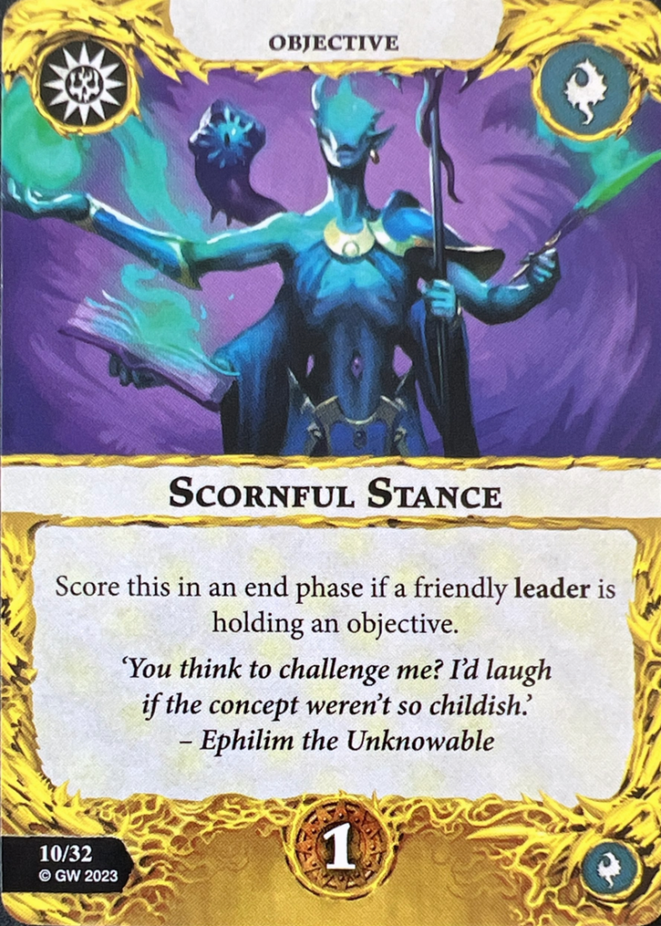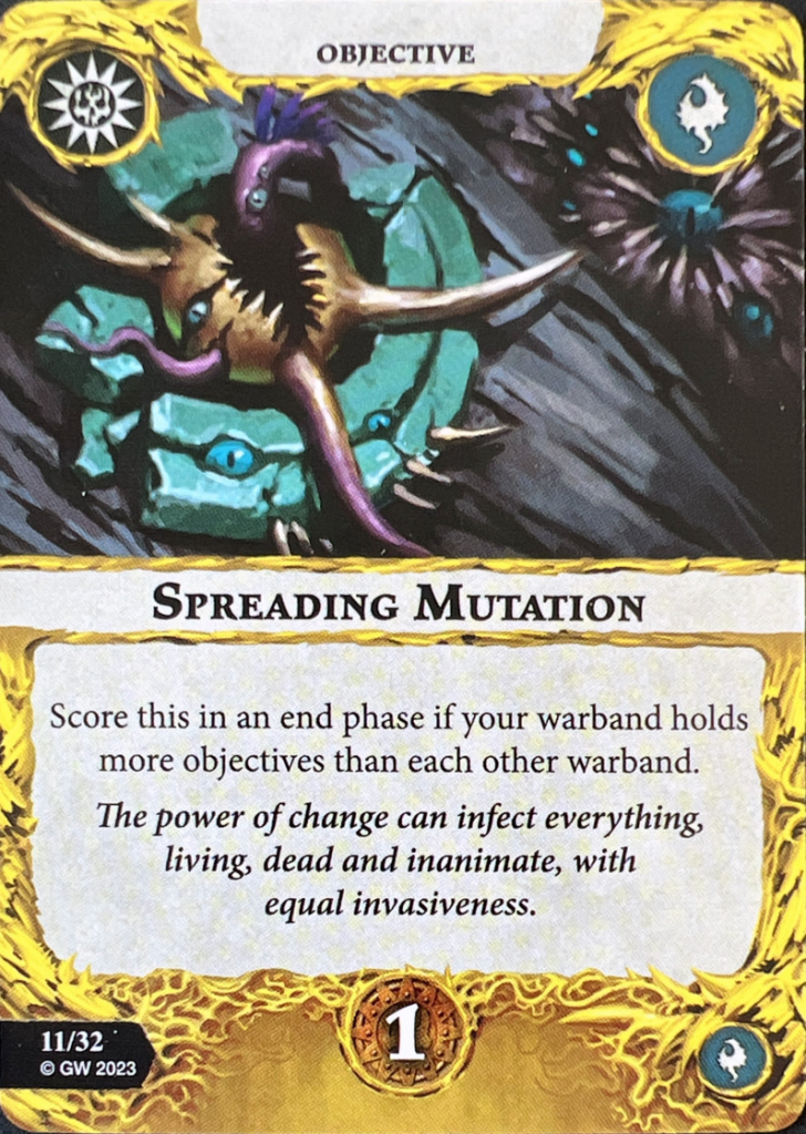 Spreading Mutation – The less dominant Dominant Position. Hold most objectives for 1 glory. If you are running a hold objective build, there are probably going to be much more rewarding options. If you cannot find one of those, then run this, but even then, there are better 1 glory objectives such as Gifts of the Gods (since it is a Hybrid and is arguably easier to score). Additionally, unlike The Dread Pageant’s Excess of Avidity, opponents won’t be as worried about denying this card since Avidity is 2 glory while this is only 1.