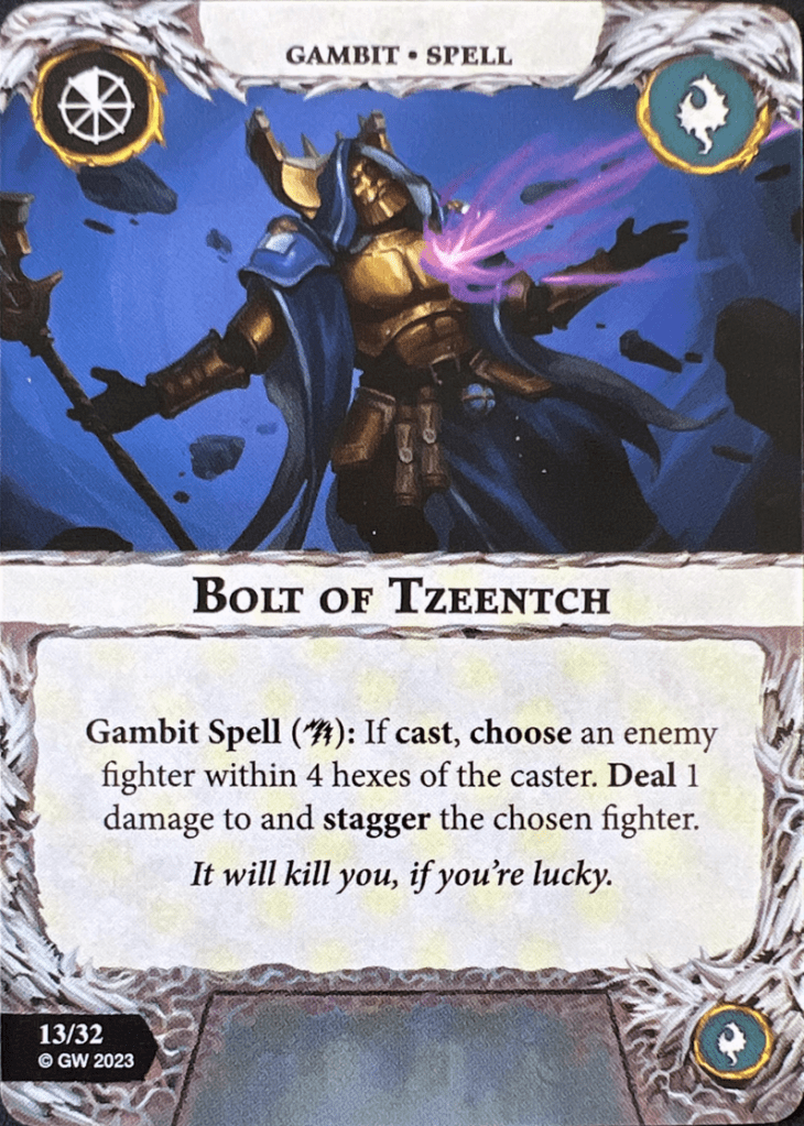 Bolt of Tzeentch – A standard spell ping. Right around the time of writing this I found out Harrowdeep isn’t getting rotated, so I would also recommend running Agonizing Bolt alongside this for a Sudden Demise build. Overall, Bolt of Tzeentch is better since it staggers the target, but Agonizing Bolt has the potential to do 2 damage. Both of them are also easy to cast!