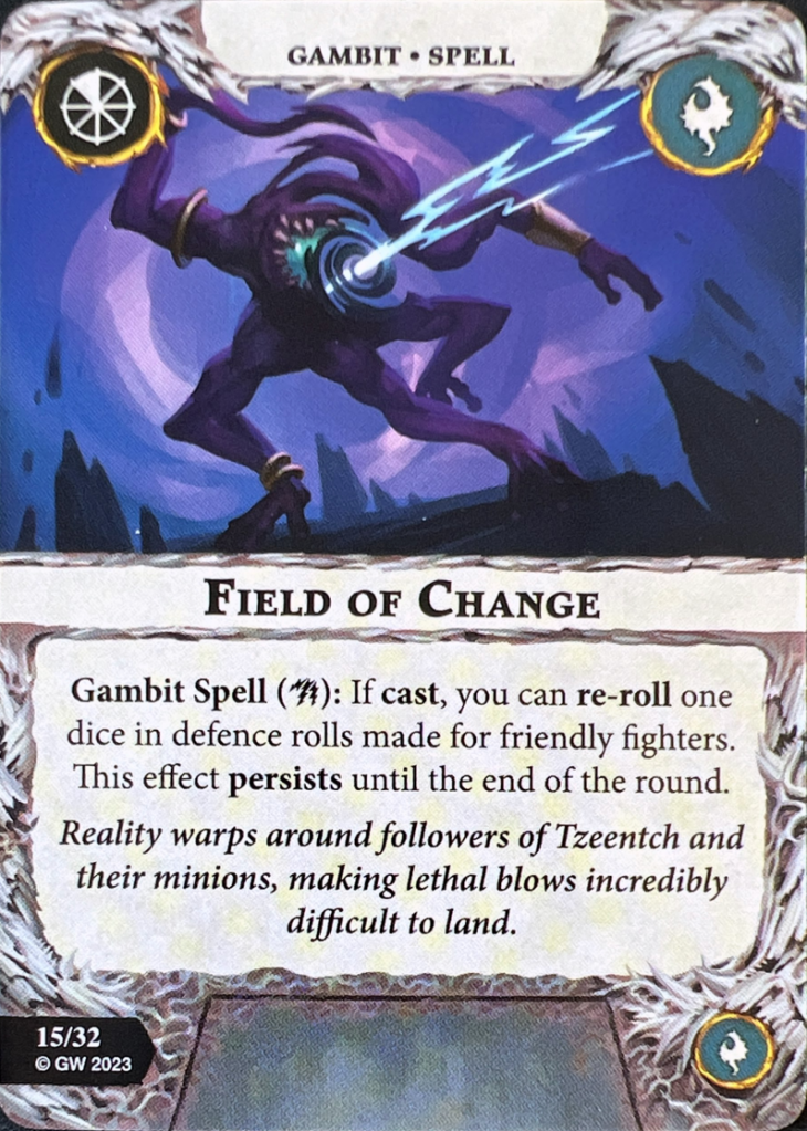 Field of Change – A really nice defense buff for the warband. It’s cast on one channel which is really easy to do, especially since your leader can get to 3 dice, and then gives all friendly fighters a re-roll in defense for the ENTIRE ROUND. The only downside is that it’s a spell, meaning it has the chance to not go off!