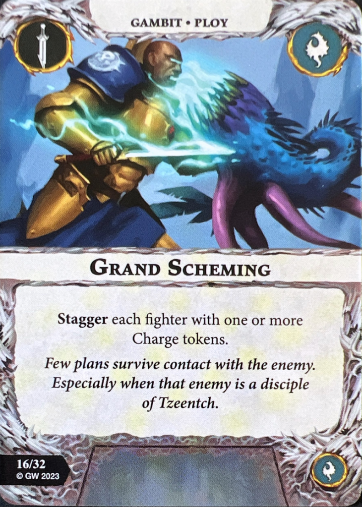 Grand Scheming – Stagger each FIGHTER, both enemy and friendly, with one or more charge tokens. In my opinion, there are better stagger alternatives than this, since, first of all, this staggers all fighters without exception with a charge token (and yours are already frail), and second there is a chance that the guy you want to kill still has not charged. If you like accuracy, I would recommend some +1 dice ploys like King of the Deeps. However, they don’t affect spells, while stagger does, in which case I would recommend Unfair Fight (great stagger ploy) or Makeshift Bombardment since you choose who to stagger, and they have no side effects.