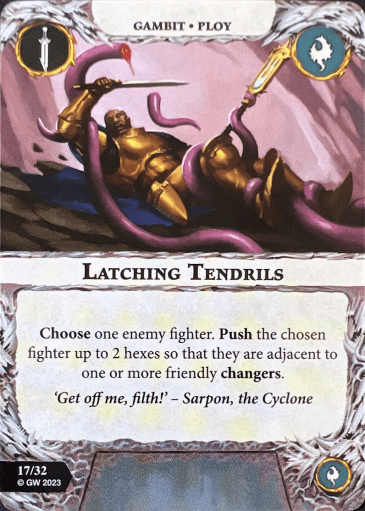 Latching Tendrils – Push an enemy fighter 2 hexes to get them adjacent to you, kind of like Starefysh’s ability. I don’t know if it’s a great card since you need to end the push adjacent to friendly fighters, but I can see the uses. For example, getting Apo’trax or Kindlefinger closer since their attacks do more damage when they are adjacent/have no move tokens. Or, use it to push someone off an objective. The biggest downside I see is its range. However, 3 hexes would be too powerful.