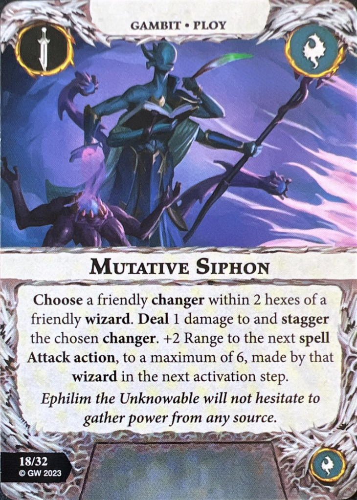 Mutative Siphon – Deal 1 damage and stagger a changer within 2 hexes of your leader, and then gain +2 Range on your next spell attack. +2 Range is excellent, getting him to a staggering 6 Range, but the changer you chose will probably not last very long after choosing them. Second, there is a card invalidating this one completely: Arcane Reach. It gives the same bonuses but does not affect friendly changers.