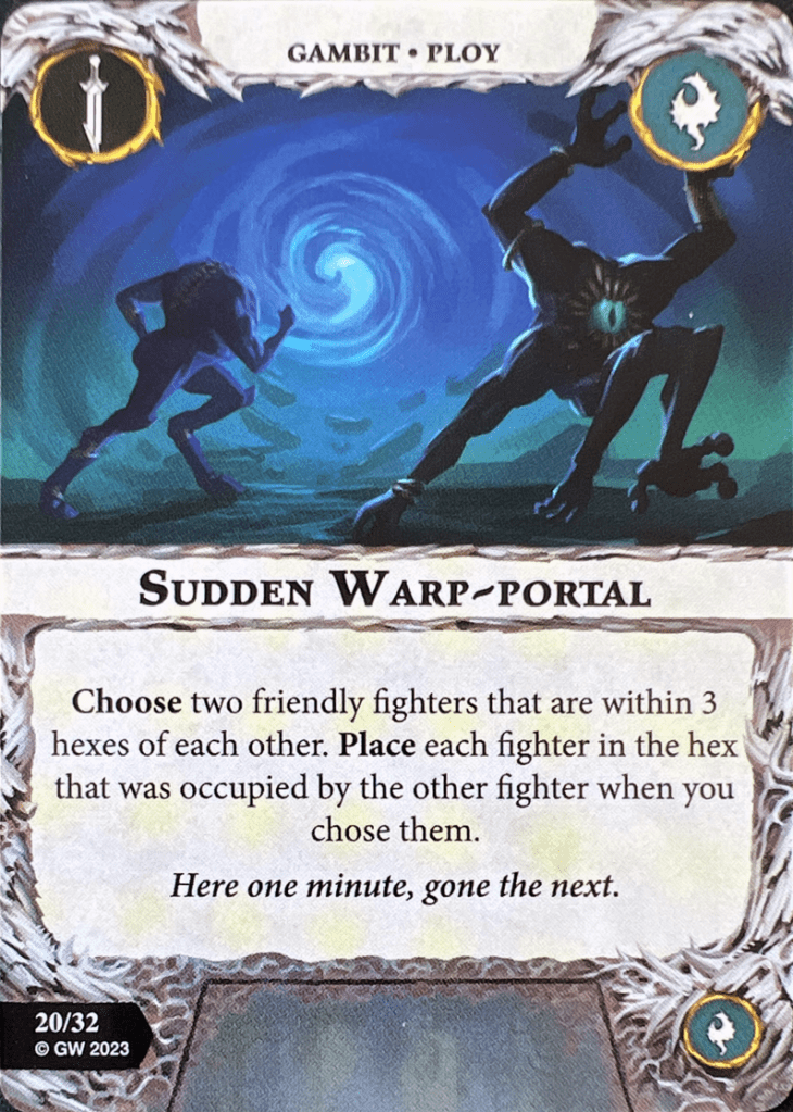 Sudden Warp Portal – Confusion+++! Switch 2 friendly fighters within 3 hexes of each other. This is a really fun card, just I don’t see it having much use except to maybe swap a fighter out of danger, or get a fighter in range, since one can’t reach but the other can, or maybe swap a fighter with a move token onto an objective that holds a fighter without one so they could take another objective. Come to think of it there are actually a lot of uses. I just think that it won’t have a good use more often than not, but time will tell.