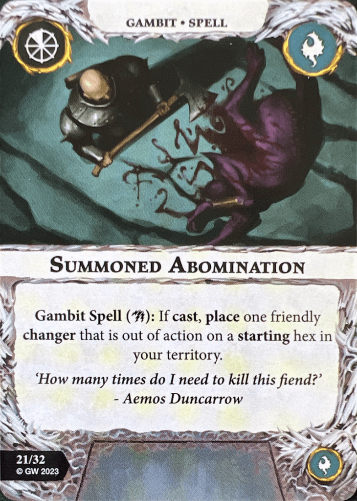 Summoned Abomination – Revive a changer! Casts on one lighting! This is a great spell, with the downside of it being a spell (can fail). You can bring back a stacked changer you gave lots of upgrades that died, you can revive a changer near your leader to gain support, or you can just bring one back to deny certain objectives like Red Ruin (Crimson Court). There are multiple uses and the best part is there is almost no downside!