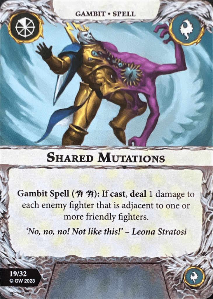Shared Mutations – A gambit spell cast on 2 lighting bolts, which deals 1 damage to each enemy adjacent to a friendly fighter (unfortunately not stacking… you could have gotten 5 damage if you put all your fighters adjacent to one). This is pretty situational and is hard to cast so I wouldn’t recommend running it. However, for Sudden Demise builds, this card just might work with the ability to ping more than one person at the same time, and not deal damage to your own fighters back like The Walls Are Closing In would.