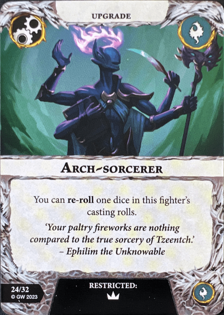 Aether-Tether – The first upgrade, and it’s an Illusion restricted to changers that subtracts one dice from enemy fighter’s attacks that target the changer. All I’m saying putting it on Kindlefinger with a guard token while playing against your friend might have a side effect of losing a friend. It’s biggest claim to fame over similar upgrades is that it has no Range restriction, meaning Hexbane players are affected as well (I don’t have anything against Hexbane, but they have the most powerful Range 3 attacks so I use him as an example). Plus, all your changers are already pretty dodgy when inspired, so this would just make them more annoying to hit. Also, I just realized these guys are Chaos Grand Alliance so Weighty Blessing + Gifted Bulk + Guard Token + this on Kindlefinger might be considered a war crime. This card’s biggest downside is that it’s an illusion and breaks at the end of the phase.