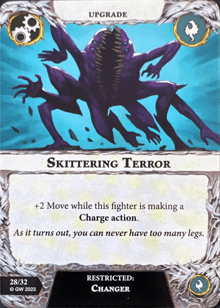 Skittering Terror – Restricted to changers, gives them +2 move when they are charging. I don’t like how it’s restricted only to changers, who are meant to be expendable, but I do like the card. This lets Spawnmaw go to a staggering 10 hex threat range! That, or it can be used to reach people who thought they were safe, since they are a couple hexes out of your threat range. If you are into aggro, this is great. If you are into hold objective, run Shadow Mover. However, most of your fighters don’t have threat range problems, meaning this card is solving a problem that isn’t problematic.