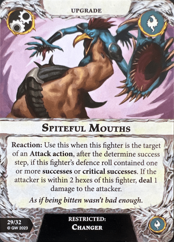 Spiteful Mouths – This card cannot have the ‘changers are expendable’ argument applied to it, so I have to say this is good. Whenever the changer this is attached to gets attacked, and they rolled one or more successes in their roll, before taking damage, they can do one damage to the attacker if they are within 2 hexes. Hexbane is laughing now, but others aren’t. This card can screw up a really important charge for an opponent, by killing the person who is doing the charge, or just bringing them to low wounds. Another good thing about this is mind games, since your opponent might not charge the fighter with this because they are scared of the damage! Overall, a really great card, with the only downside being that it’s restricted to changers (which is reasonable).