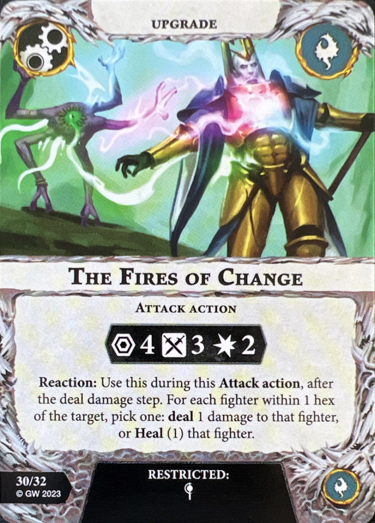 The Fires of Change – This is a pretty good card, restricted to wizards (your leader). It’s an attack acton with 4 Range, 3 Swords, 2 Damage, and a reaction that allows you to deal or heal 1 damage to each fighter adjacent to your target. This affects both friendlies and enemies! This is a pretty good attack, made worse by your leader already having a pretty good Range 4 attack. This is a really good card early game and against swarm warbands, who pile up together, though! Run this if you feel you need more damage or don’t like grouping your changers and leader for his Power Leech ability. Otherwise, I would pass.