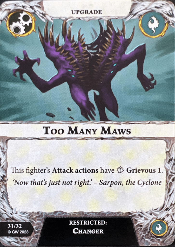 Too Many Maws – The ONLY way Great Strength is worse than this is because Great Strength doesn’t affect Range 3 attacks, while this has no range restriction. This card is restricted only to changers, and it gives all of their attacks Grievous 1. Great Strength is better because a) it can be given to your leader to make him have a powerful Range 2 attack, b) it gives a guaranteed +1 damage, unlike Grievous here. However, Great Strength does not affect Range 3 attacks which most of your changers have. Most of your Range 3 attacks have only 2 dice, making it tough to roll a crit to proc the Grievous. Unless you REALLY like the Range 3 attacks, I would just run Great Strength instead (or both?).