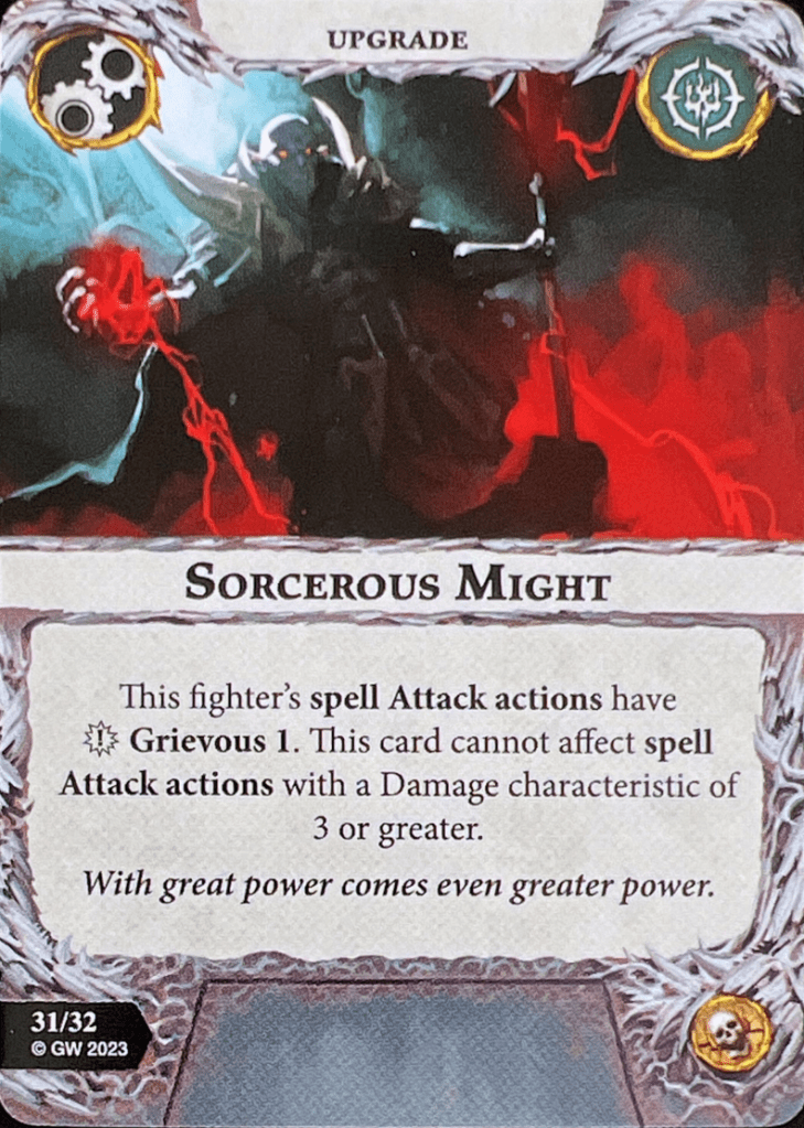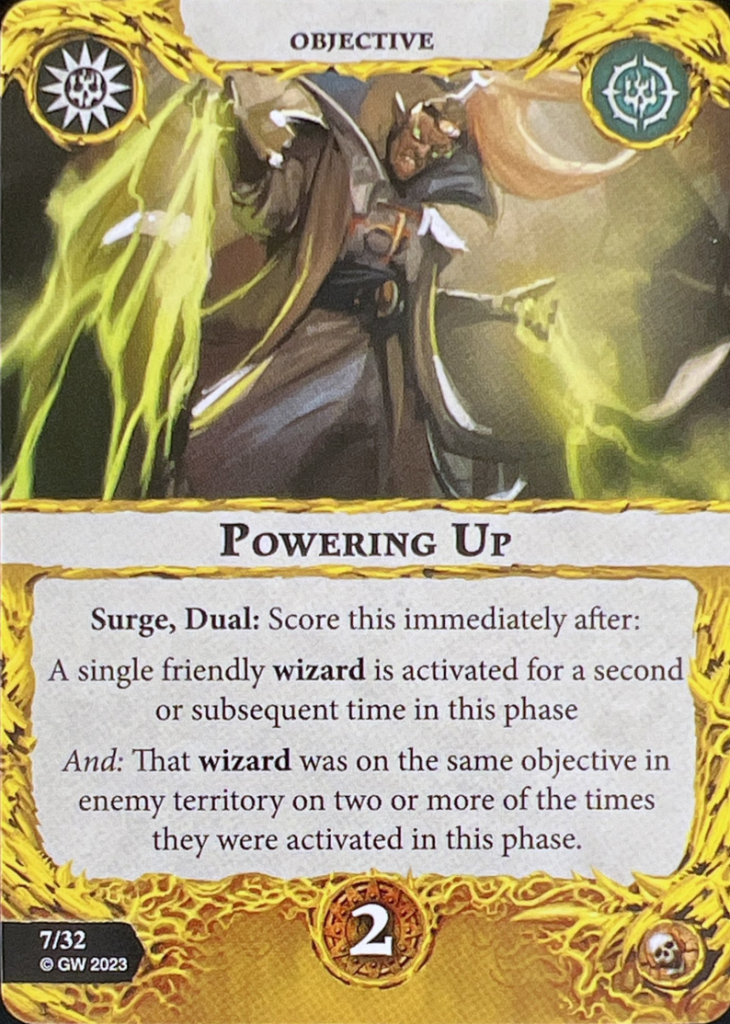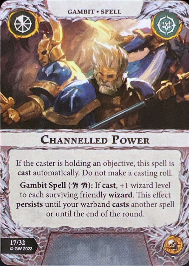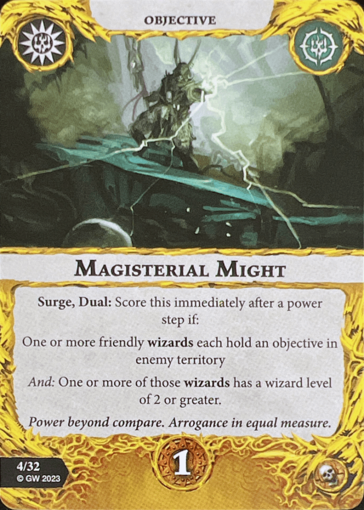 Magisterial Might – Score this after a power step if a friendly Level 2+ wizard holds an objective in enemy territory. This is really good! The downside I see is that there is only 1 warband with more than one Level 2 wizard, meaning you are putting your likely-to-be most valuable fighter in enemy fire when scoring this. However, if your wizard is tanky, I recommend this for sure! Overall, a great card but requires you to risk a strong fighter.