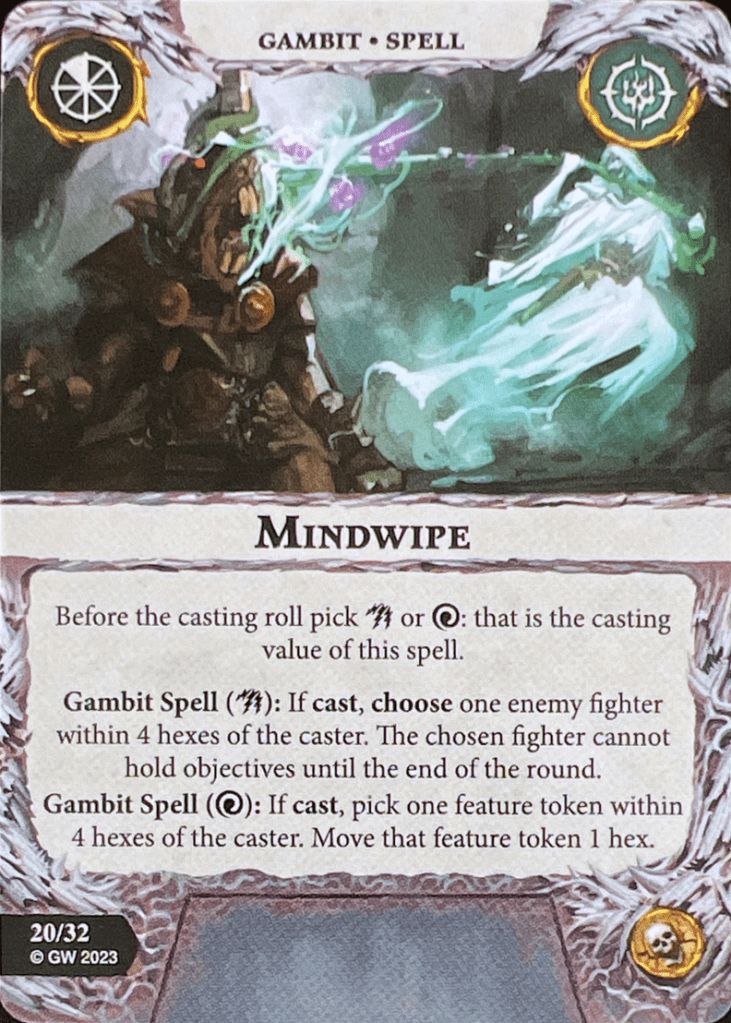 Mindwipe – A double spell, which can either be cast on one swirly or lighting. If you choose swirly, the spell lets you move a feature token within 4 hexes one hex. This is nice and has a lot of uses, from getting someone onto a token to getting someone off of a token. If you choose lighting, you can pick an enemy within 4 hexes and make them unable to hold objectives till the end of the round. Both choices have excellent disruptive potential, and this card can also be used to help out a friendly fighter, meaning if you are keen on holding objectives or live in a Fearsome Fortress-infested area, this is a good card!