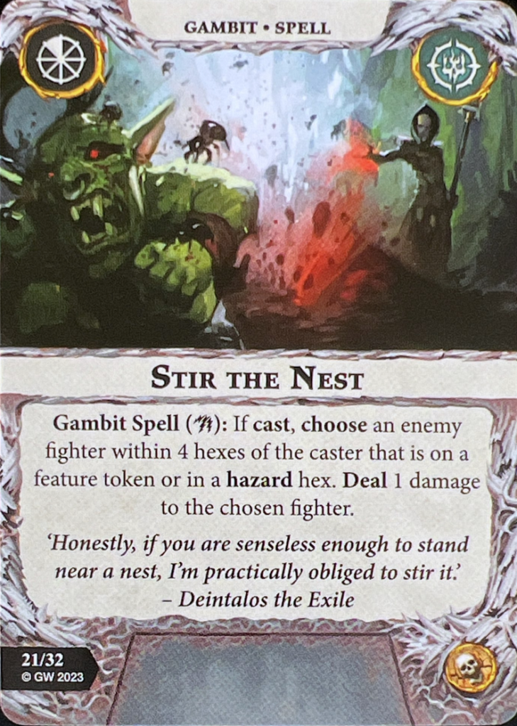 Stir the Nest – MORE disruption for feature/hazard hexes. Casting on one lighting, it lets you ping an enemy in a hazard/feature hex for 1 damage. This is pretty nice, however, Lethal Ward exists, and it has no range restriction. The upside of this over Lethal Ward is that it can be used on people in ANY feature/hazard hex (which there are a lot of now), unlike Lethal Ward. Overall, if you like using boards with many hazard I would use this. I can see it being used in a spell-spam build on a hazard-filled board!