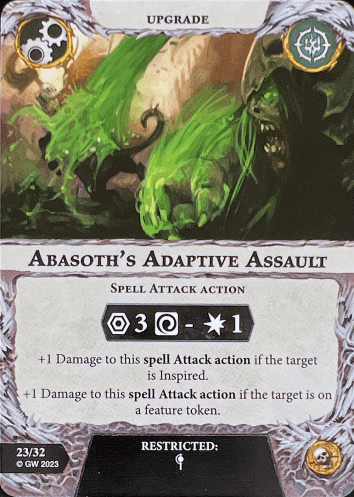 Abasoth’s Adaptive Assault – A spell attack, casting on swirlies with 3 range and 1 damage. It gains +1 damage if the target is Inspired and +1 damage again if the target is on a feature token! This makes it a potential 3 range and 3 damage spell attack! If your warband lacks spell damage, I would run this card for sure since it’s pretty often that you target an inspired enemy (and the feature token part isn’t too difficult as well), meaning you will constantly be hitting 2-3 damage! However, the accuracy isn’t great, and sometime you might just not need this damage and just want a Cursed Boarding Pike or something else.