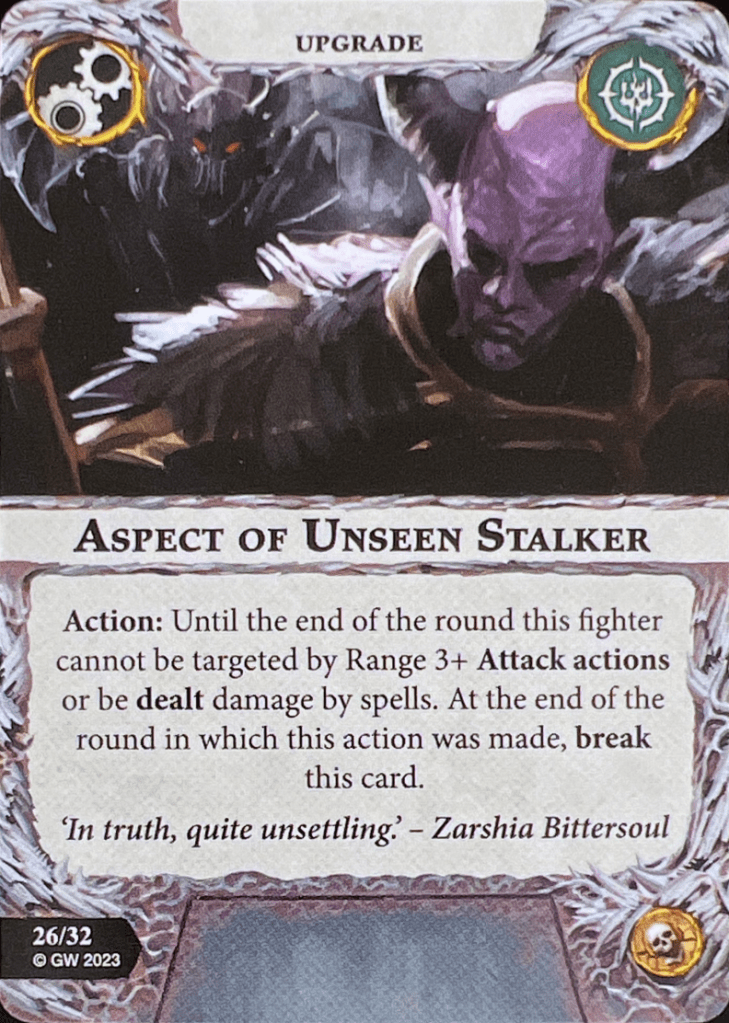 Aspect of the Unseen Stalker – Make yourself untargetable by Range 3+ attacks and immune to spells for the round. The downside of this is that it’s an action. Playing against some warbands (Hexbane with his guns) will make this card worth it, but in other cases (which are, unfortunately, most cases) this card is worthless.