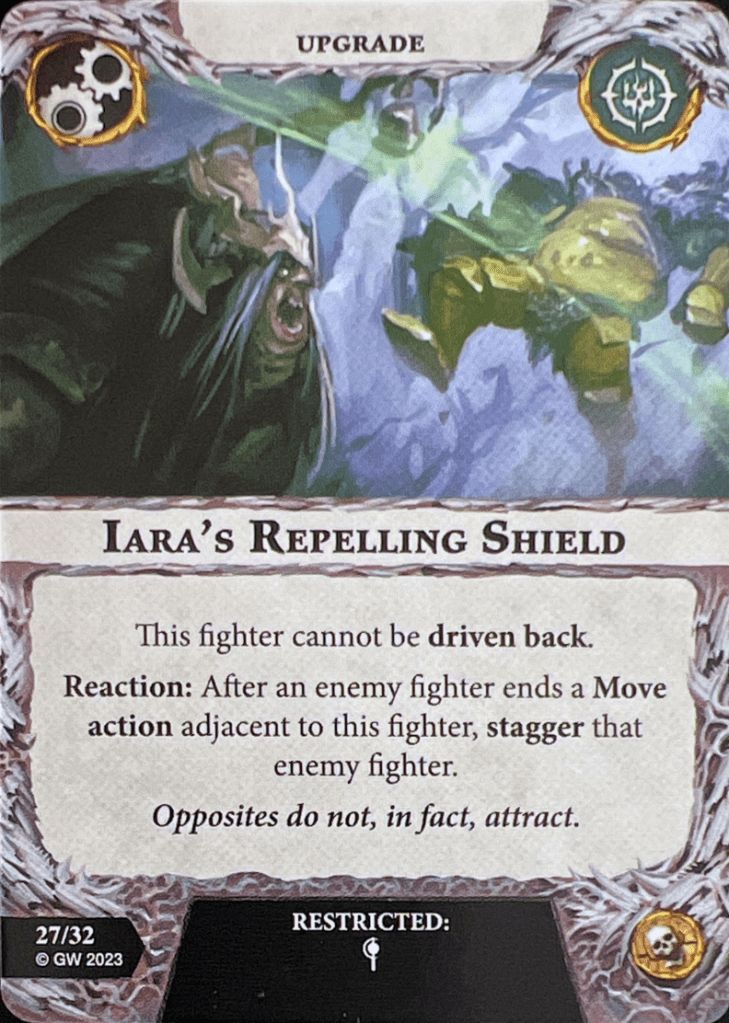 Iara’s Repelling Shield – Shame that it’s restricted to wizards! This card makes you unable to be driven back as well as staggers anyone who ends a move action adjacent to you. This is a really nice card, especially for Hold Objective players. Darkwater Anchor is better in a lot of cases, but you can run both for double stability! Additionally, the stagger effect is nice too. It’s a real shame it’s restricted to wizards cause I can see a lot of other fighters getting bonus from this.